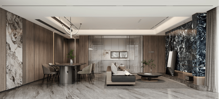 升级X空间,更加有层次感,整个立面更加立体、干净、高级建筑基座外墙主要采用石材和铝板,标准层采用真石漆 屋顶采用大面积银灰色穿孔铝板分割主体与屋顶飘板,顶部采用香槟色金属漆的处理方式,丰富建筑形象,增强地标感。五星级酒店环岛式主大门,高约5.4米,宽约34米,做足豪宅气势