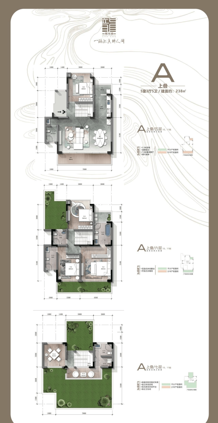 【基本信息】 总占地面积:42亩,容积率:1.5,绿化率:35%,总户数:184,物业费:4.9元/㎡,楼层总高:6+1,3,交付标准: 清水交付,交房时间: 预计2023年12月31日,产品面积:A户型 建面约235㎡~271㎡;B户型 建面约237㎡~284㎡;C户型 建面约209㎡~269㎡;E户型 建面约410㎡~470㎡