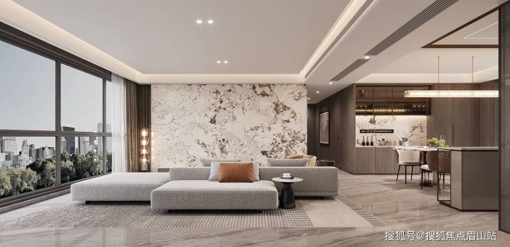 新奢印象 超镜体都会天际线⦿由光影编排的建筑格局,绘就空中立体的海超镜体映景立面,随角度的变换,流映自然四季与超塔的视觉艺术。以欣赏者视角为设计语言,锻造香槟金铝板,镶边轻奢金属线条,米灰色仿石漆、落地窗、大面宽的艺术界面,塑造蓝灰LOW-E幕墙的流线美学,契合高窗墙比,让建筑体本身成为一道风景线。