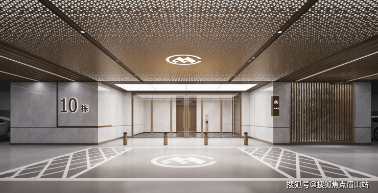 主入口采用门庭与景观一体化设计。超30米阔尺仪门与约5.6米挑高,采用深灰石材墙面与铝板顶饰,彰显尊崇气质;