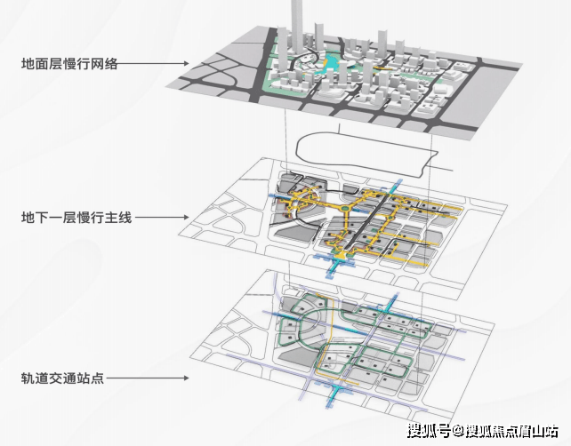⦿地下加密:在轨交站点、区域地标及商业中心间的主体步行空间设置了活力商业广场,布局文化、休闲、展示等公共服务功能;同时依托轨道客流构架慢行主线,以及地下独立车行系统及各物业单元的地下大堂、地下停车场系统互通互联,并通过简洁导引系统进一步完善交通。