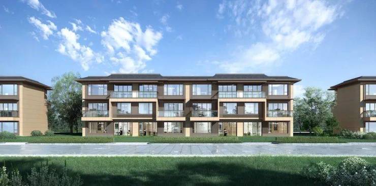 建筑整体排布顺应了长达1公里的湿地景观线,临湿地一侧布局的是2+1的叠拼,可直观湿地景观;社区内部为南北向的上下两叠产品;而地块的东侧,排布的则是上中下三叠产品。