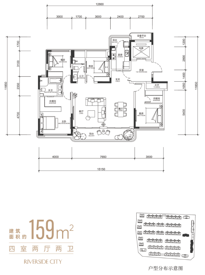 面积段:建面约174-325㎡江岸雅奢墅境 建面约129-159㎡天际阔景平层