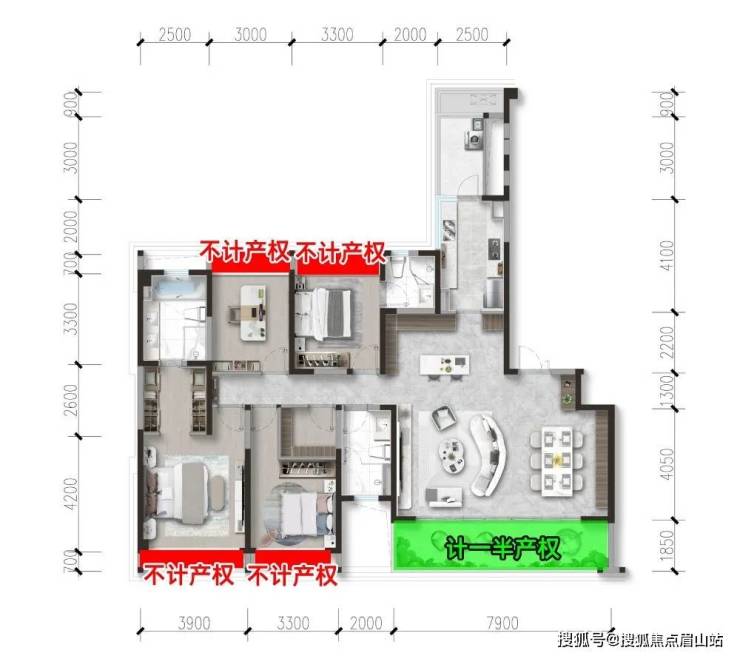 从得房来看,进深约1.85米的景观阳台计一半产权,4间飘窗不计产权;且4间飘窗分离出一些X多功能区域,可储物、改造,让整个户型得房甚为可观。
