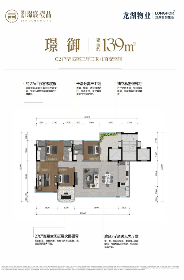 作为入门级改善户型,在约113㎡的面积内实现了四房两卫的功能,实得面积约130㎡,得房率高。户型设计紧凑实用,满足多口之家对房间数量的基本需求,是入驻城芯奢宅的高性价比之选。