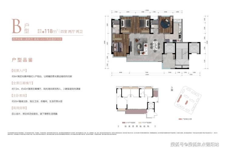 3、B户型118平米赠送面积:25㎡(含入户前厅)、得房约143㎡;