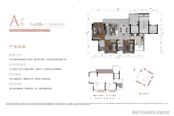 2、A户型108赠送面积:21㎡(含入户前厅)、得房约130㎡;