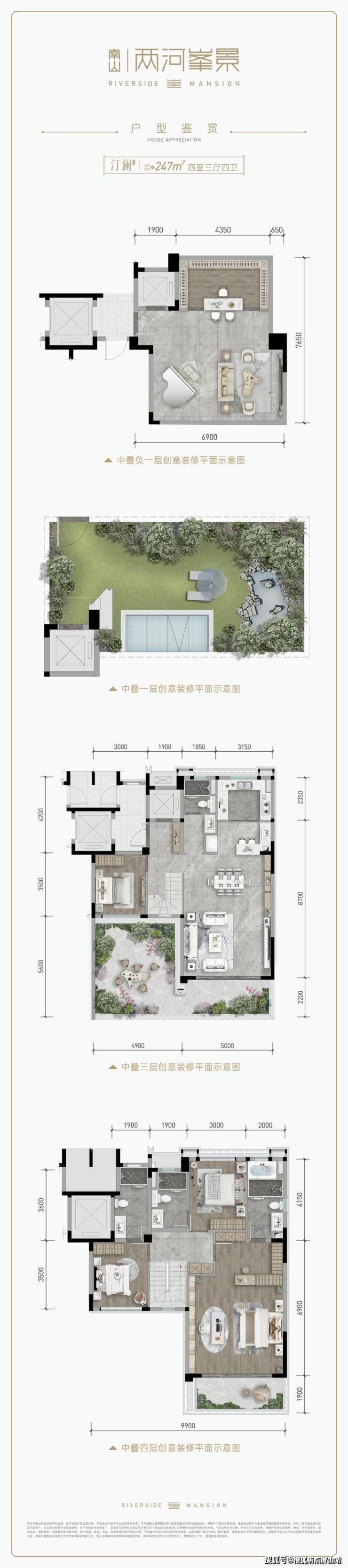 ②叠拼:上175㎡ 4室2厅3卫屋顶花园中247㎡ 4室3厅4卫后花园下249㎡ 4室4厅4卫前花园中下叠带地下室5.4米(47-52平米)