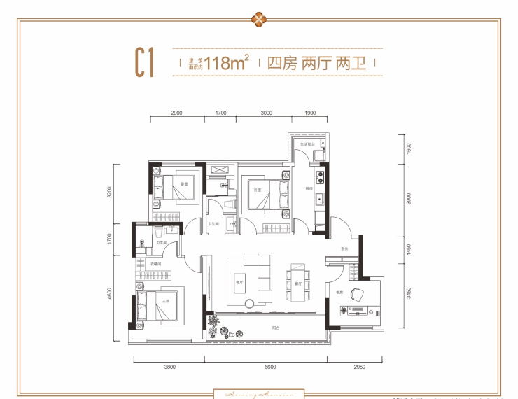 C1户型 约118㎡ 四室两厅双卫双阳台
