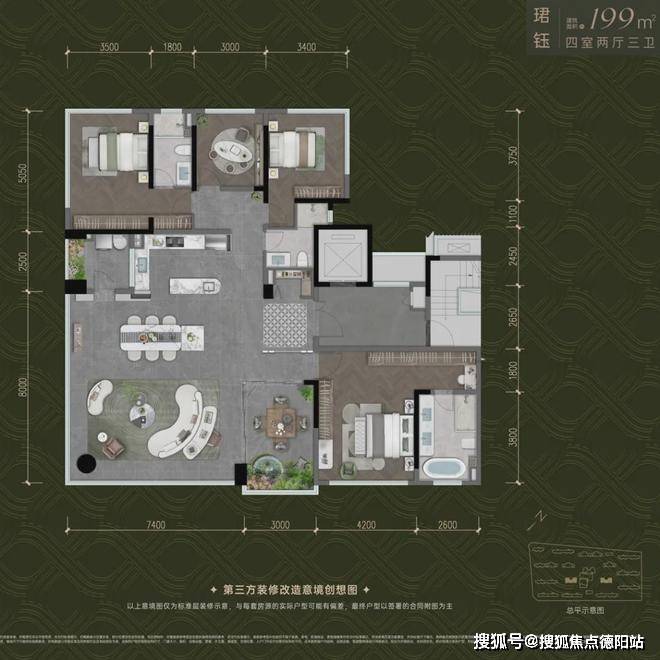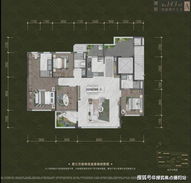 空间创新:空中岛院,每户均赠送私人空中院落,143-199㎡户型拥有4X空间,住户可根据个人喜好打造多功能空间,甚至改造为5房。