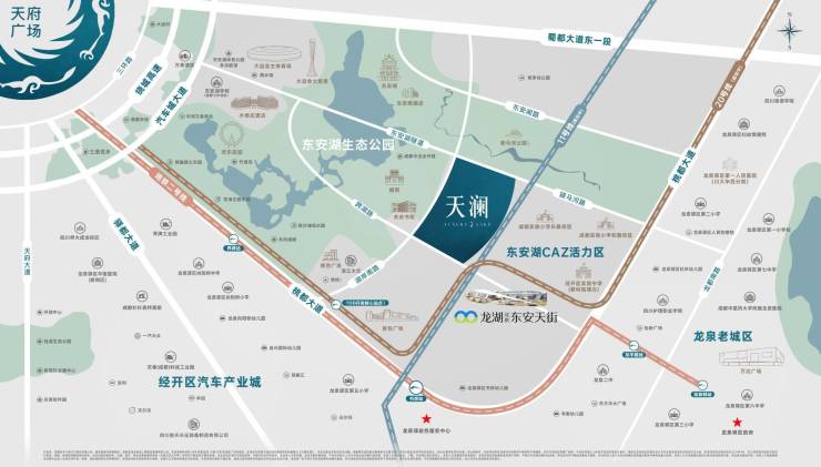 【2⃣ 东安湖高端生活主场,南岸中央CAZ活力区】项目北揽5000亩东安湖生态,南拥龙泉驿区约20万方最大商业 综合体——龙湖东安天街+吾悦广场,兼具静谧生态与繁华商圈,汇聚东安湖最好的配套资源