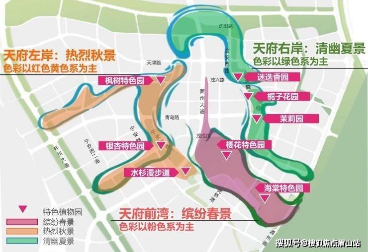 其中天府前湾将以粉色系为主,布局200亩樱花特色园、60亩海棠特色园;天府左岸以红黄色系为主,40亩银杏特色园、25亩枫林特色园、3公里水杉漫步道;天府右岸以绿色为主,茉莉园、栀子花园、迷迭香园。绿肺环伺,实现真正的公园城市生活