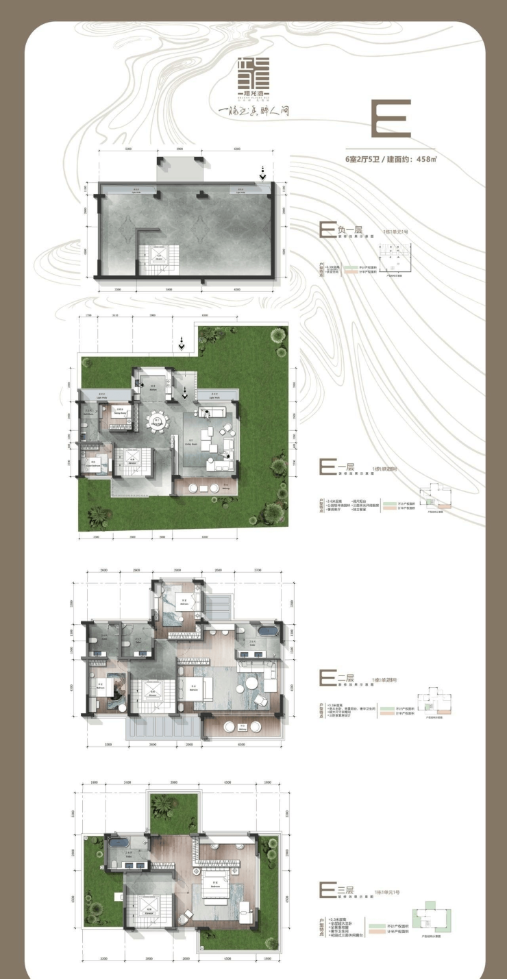 【基本信息】 总占地面积:42亩,容积率:1.5,绿化率:35%,总户数:184,物业费:4.9元/㎡,楼层总高:6+1,3,交付标准: 清水交付,交房时间: 预计2023年12月31日,产品面积:A户型 建面约235㎡~271㎡;B户型 建面约237㎡~284㎡;C户型 建面约209㎡~269㎡;E户型 建面约410㎡~470㎡