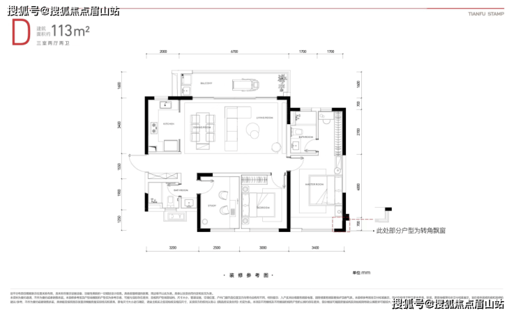 主卧向南,带一个可采光的转角衣帽间,这在113平的户型中比较少见。赠送部分,会有一个1.6米宽,6.7米长的开放式阳台赠送一半的面积,约5.36平;另有主卧飘窗面积全赠送,约2.38平。