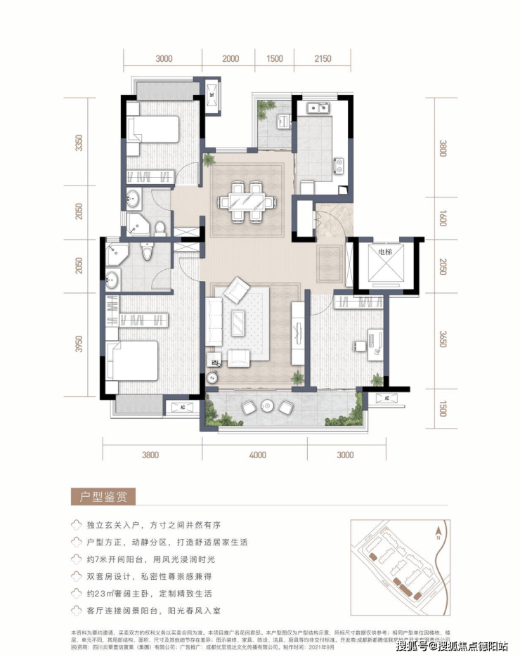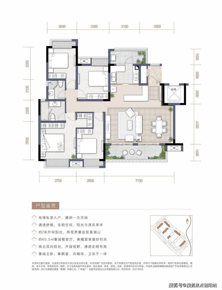 【纯板式结构,围合式布局】:板式结构通透设计,南北通透;围合式布局,约65米超宽楼间距,空间最大化确保私密性和宽阔视野
