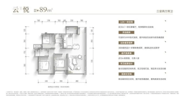 作为项目的高效功能型产品,该户型实现了三房双卫的稀缺配置。设计上强调空间利用率高,布局合理,在有限面积内创造了完备的居住功能,是年轻菁英家庭或人才客户首次置业安家的高性价比优质选择。
