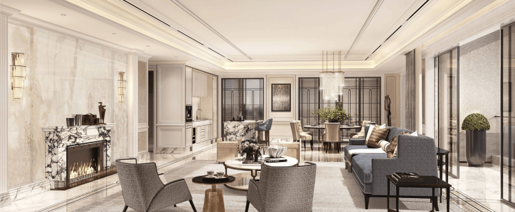 项目复刻其经典装饰主义,约10m挑高大堂,挑空拱门架构的恒温泳池、孔雀廊般的艺术展廊,层叠线条,艺术家真品装置等,让峯层生活从此同频华尔道夫