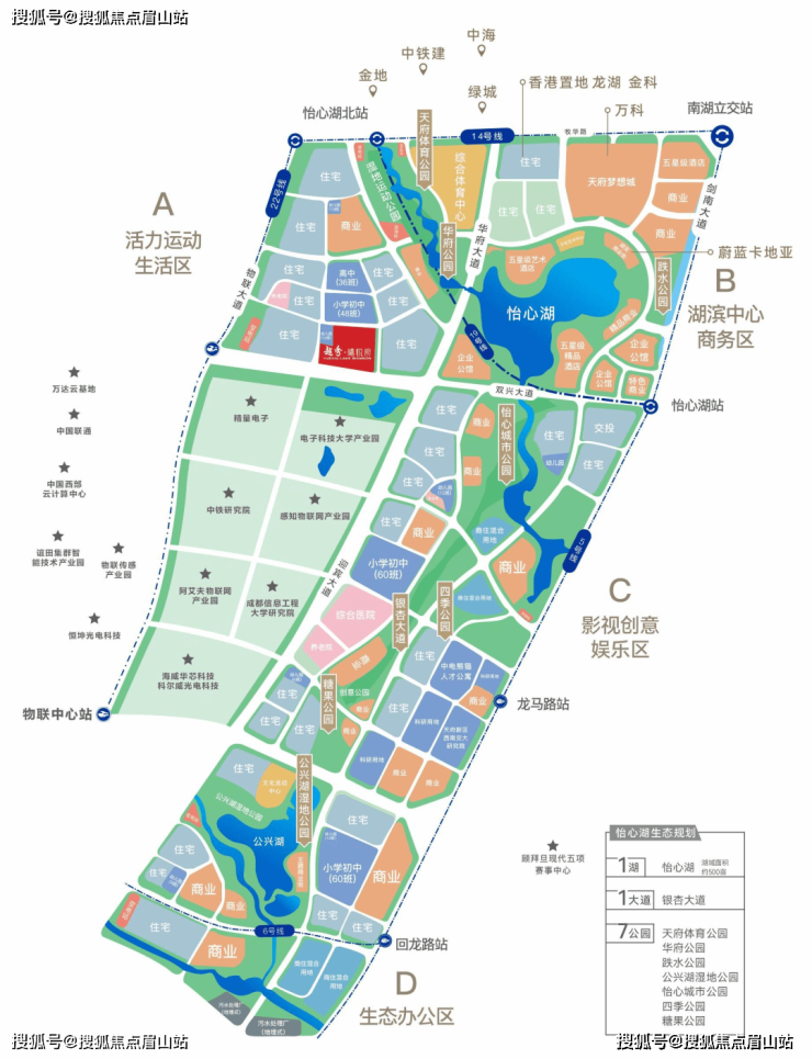 2015年,地处“中优、南拓”双核心区域,总面积约12600亩(约8.4平方公里),以新加坡滨海湾为蓝本,的怡心湖正式进入大众视野。这里分为A区为活力运动生活区、B区为湖滨中心商务区、CD区聚焦数字经济,四个区域渐次开发,产业、商业、居住用地比例为3:3:4,这就是“以湖带产、以产兴城、以城定居”的产城湖3.0。至此,新城南金融城锦城湖,秦皇寺兴隆湖,怡心湖锦江生态带形成三足鼎立发展之势。约500亩湖面为核心的怡心湖区域成为城市级的发展引擎。