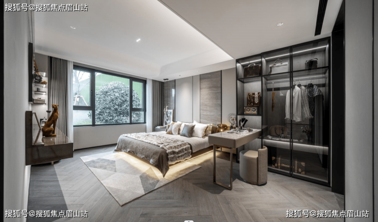 ?3.9m开间:主卧床前可放置 0.8 米宽的长桌,还留有 1 米宽松区域,可以是电视机/梳妆台/工作台,深夜足不出房实现办公,避免打扰家庭其他成员。