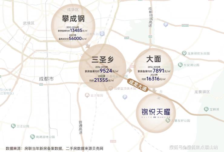 从攀成钢到三圣乡再到大面,成龙大道宛如一条璀璨的金色丝带,巧妙地将这些重要节点串联起来,形成了一条独特的城市发展轴线,串联着过去、现在与未来,见证着城市的崛起与变迁。成龙大道的发家史,有迹可循,有据可依,不同区域的日益见涨的房价,无疑是最好的佐证。