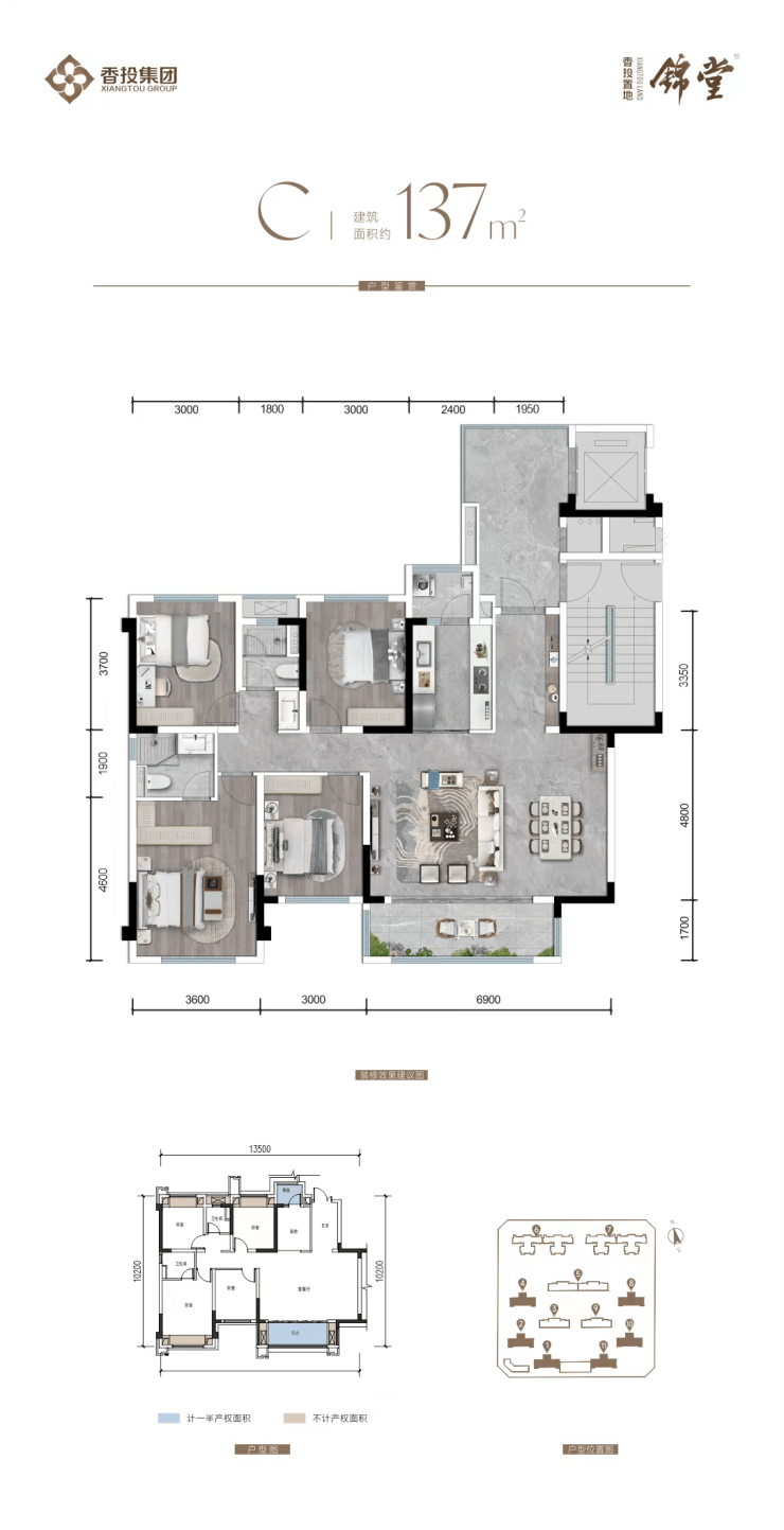 观景洋房(1#、2#、4#精装交付):建面约137㎡,赠送面积约22㎡