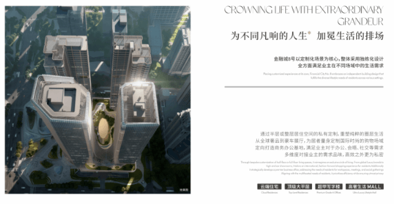 作为金融城一期罕见的纯高端住宅,项目以约27亩的占地面积,规划了4栋约160米的超高层塔楼集群。其中,住宅产品仅占据一栋,通过极致的规划确保了圈层的绝对纯粹与视野的无可匹敌。