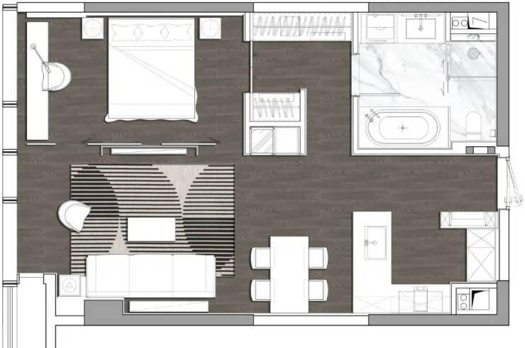 创新"无界生活"理念,客餐厨一体化设计增强空间互动性。配置多功能吧台、全景落地窗,主卧套房配备独立衣帽间及豪华卫浴系统,实现小户型的奢适体验。