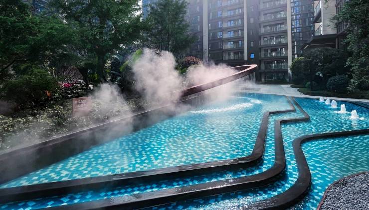 小区园林景观以“森居岛岸”为设计思路,将森林、岛屿感引入日常生活中,弱化景观与建筑的边界,增强人与环境、环境与生活的互动感。中庭铺陈大面积水景,水中艺术雕饰作品时尚典雅,沿岸花木高低错落,营造新加坡滨海式园林景观,移步异景,诗意弥漫。
