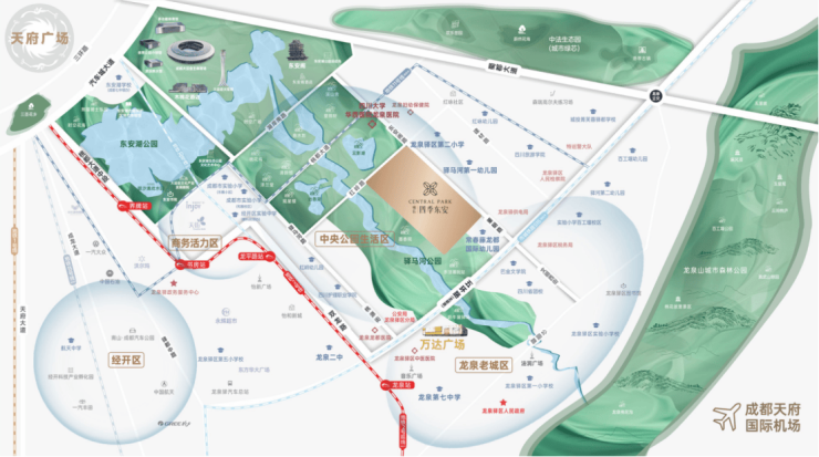 ——生态价值——坐拥一湖一山一园一湖:成都·东安湖【5887亩】世界级国家体育公园,围绕“一湖三岸”建设一山:成都·龙泉山【海拔1051米】国家城市森林公园,城市自然分界线一园:成都·驿马河公园【1910亩】城市中央公园,城市生态连廊,“天然氧吧”