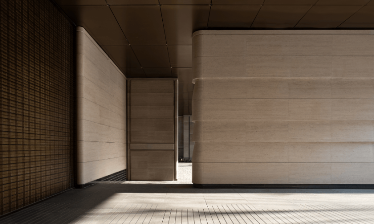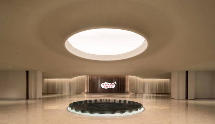大门整体长约72米、高约5-8米,立面选用温润的海岸地貌石材打造,从“揉石成缎”到整石收边、石材榫卯结构等百匠工艺的表达,渗透着内敛精密的数学之美。