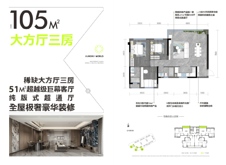 【105㎡-稀缺大方厅三房】稀缺大方厅三房,51M²超越级巨幕客厅,纯版式超通厅,全屋极奢豪华装修(4号地块6栋)