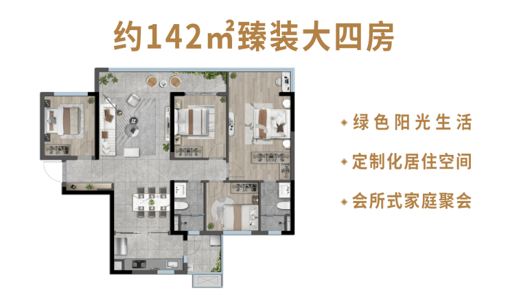 【宁静与奢华 约142㎡臻装大四房 】l独立玄关入户 精致收纳l四开间约13.5米巨幕面宽l约6.9米奢阔观景阳台lLDK巨厅餐客厨一体化l约27㎡豪华套房主卧l阔景大四房 轻松满足三代同堂