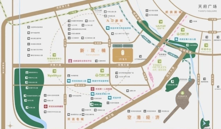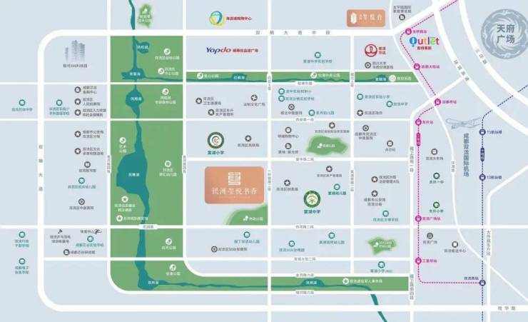 生态:以东约500m即占地约460亩,有着“双流人民公园”之称的棠湖公园,其中湖区部分就有约70亩;以西约500m,则是由9大人工湖及湿地公园组成的超级生态,占地约8500亩,相当于50多个人民公园那么大,整体呈“十”字型布局,均按照5A级景区标准打造,10分钟生活圈即可得。