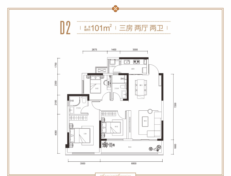 D2户型 约101㎡ 三室两厅双卫双阳台