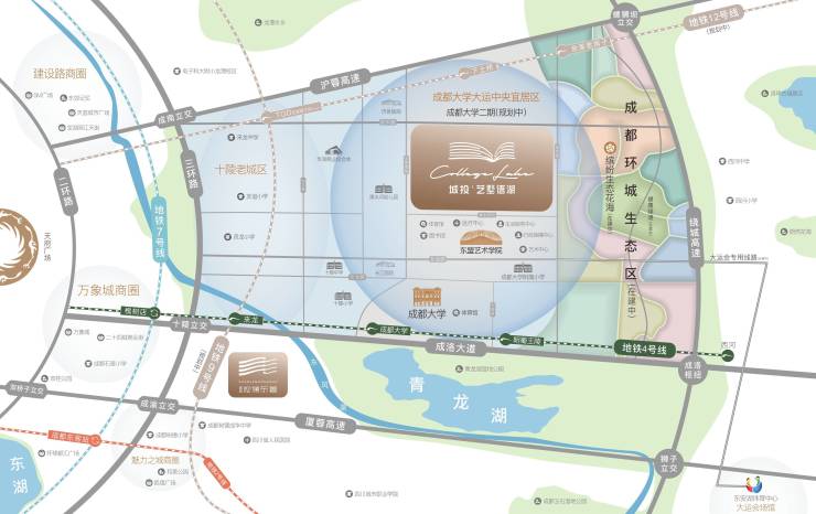 项目配套价值让湖与生态的 成为日常的艺墅语湖位于青龙湖区域内,坐拥整体规划达30000亩的青龙湖湿地公园,与成都大学嘤鸣湖、东盟艺术学院内的生态湖形成三重湖景,让业主享受到一步一水景的湖居生活。东侧毗邻以“花田+体验式农场”为主题的缤纷生态花海,让日常生活与生态自然相拥。