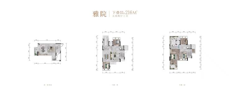 下叠户型:216㎡(五室两厅三卫),配备40-80㎡下沉式花园,总价500-540万