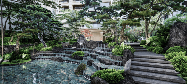 ④星级酒店式度假园林,享受高端生活松弛感度假酒店风格园林,用自然主义的手法将建筑隐于绿林中,以“水系+森系”两大灵感元素构建流水森境,让居者成为自然的座上宾