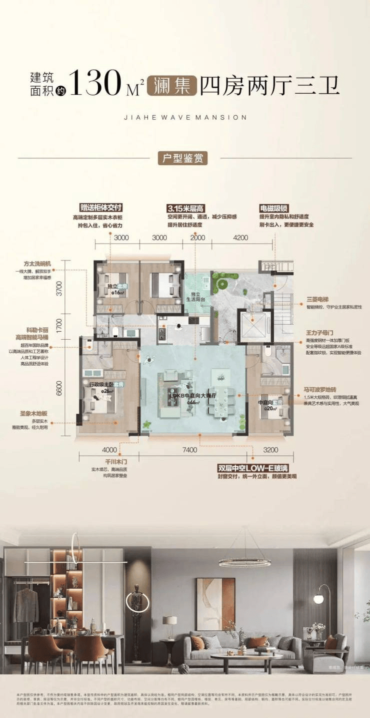 LDKB一体化,连接超7m宽中庭向大面宽阳台,全景落地窗,视野开阔