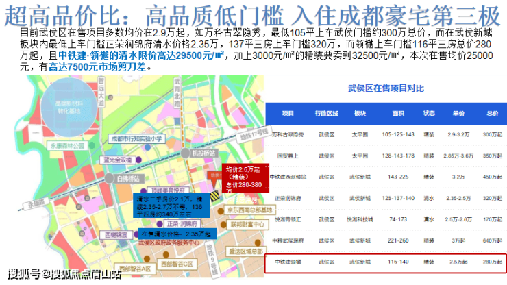 【项目数据参数】🔷开发商:武侯资本X中国铁建地产🔷容积率:2.0🔷总户数:806户🔷在售楼栋:东地块1# 6# 1号块1# 3#🔷物业类型:纯住宅/纯洋房🔷建筑高度:7~13层🔷占地面积:约77亩(46+31亩)🔷户型区间:约116㎡三房/140㎡四房🔷总价:116㎡300万左右 140㎡360万左右🔷交付标准:精装(标准2999元/㎡)🔷交房时间:2026年3月(具体以合同为准)🔷户型结构:正南北朝向板式/2梯2户🔷入户方式:电梯独立入户,赠光厅入户厅🔷物业公司:华润置地物业 物业费:3.7元/㎡🔷地铁配套:四大TOD(白佛桥 双凤桥 机投桥 武青南路)+5条地铁(3/9/17/29/33号线)
