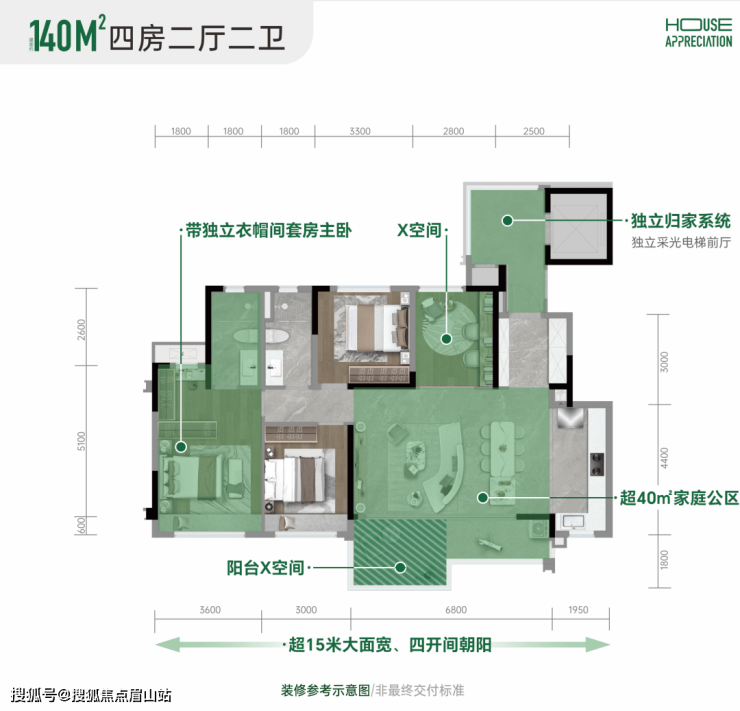 ※建面约140㎡四房,超级公区兼顾家庭全周期建面约140㎡的户型,将空间上限的突破感进一步强化。优秀的独立归家系统,标配全明设计电梯前厅,且为双面转角采光,空间开阔。这是一个典型的大面宽产品,横向面宽超过15米,卧室、客餐厅实现四开间朝阳,每一个房间都尽可能实现了“阳光平权”。室内的LDKB空间,形成了面积约48㎡的超级公区,使用感接近180㎡的大平层,同时也带来了270°的环幕景观视野。