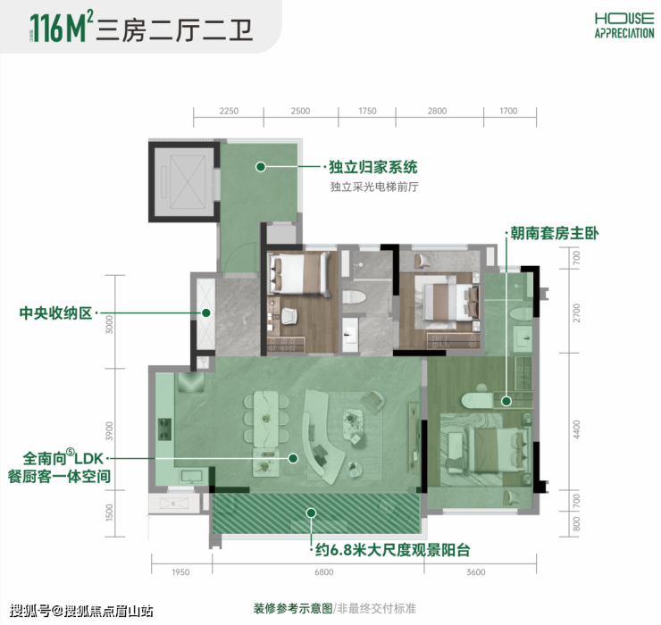 ※建面约116㎡三房,标配近10㎡电梯前厅现阶段成都楼市中流行的独立采光电梯前厅,几乎已经成为改善户型标配。但这一配置多数出现在143㎡及以上户型。当采光电梯前厅出现在领樾建面约116㎡的产品中,就实在令人震撼了,而且还是双面转角采光,实用感UP。同时,该户型还标配了一个全南向(注⑤)的LDKB厅,开间尺寸宽至约6.8米,连接约6.8米的景观阳台,可以形成一个约6.8*5.4米的阔尺家庭公区。现场可以感受到的那份视野开阔感,过去只能在许多140m²-160m²面积段的户型才常见。