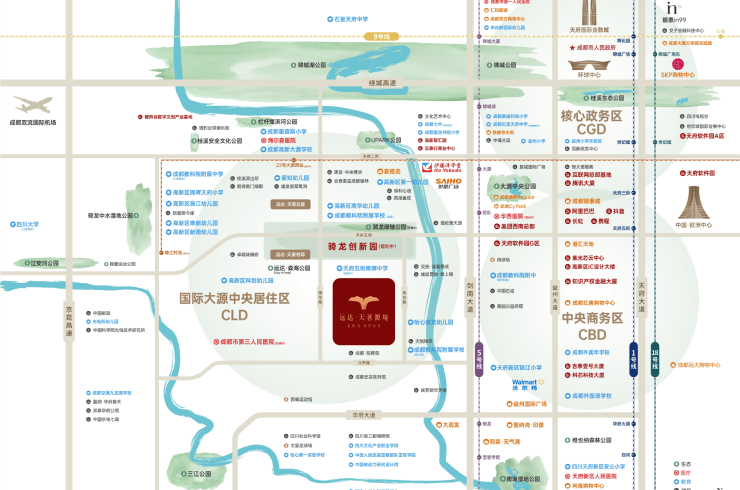远达天著源境位于高新南大热的大源西板块,作为大源最后一块可供整体开发的区域,大源西东至剑南大道,北达天府四街,南、西与天府新区、双流交界,先天区位条件良好。