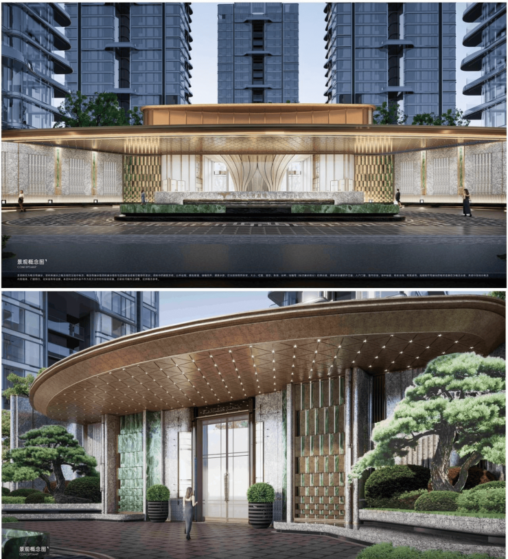 考究用材:外立面 0 漆化(铝板 + 定制陶板),甄选全球五大奢石矩阵(塞尔维亚灰大理石、迪奥金大理石等),铺陈天然奢华。