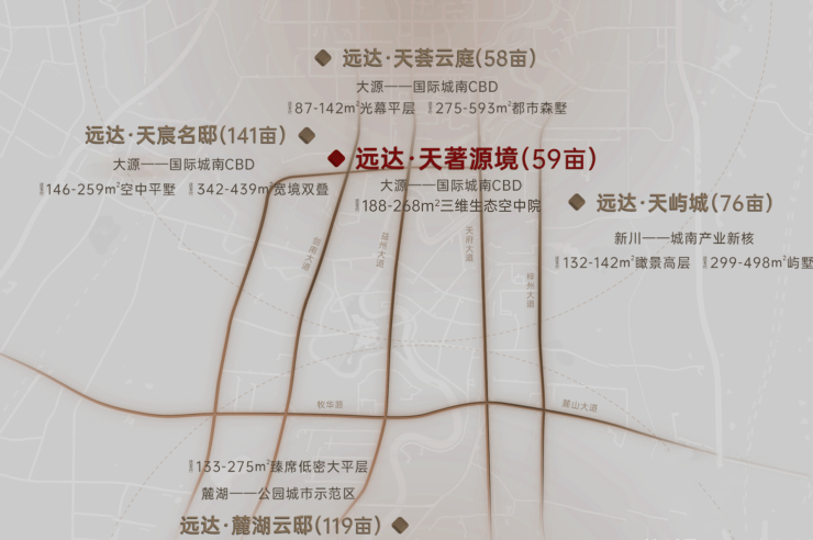 远达集团在成都布局远达·天荟云庭、远达·天屿城、远达·麓湖云邸、远达·天宸名邸、远达·天著源境五大精品项目,远达·天著源境是在高新区第4个、大源区域第3个项目;远达在成都地产投资近120亿,扎根大源5年,更懂当地土地与客户需求,以长期主义开发理念保障客户资产价值,获市场与同行高度认可。