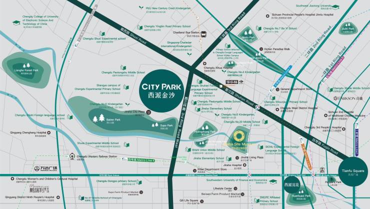 【百仁公园】占地达1770亩,百仁生态区与国家级金沙遗址博物馆和成都两河森林公园串联,将成为成都地区重要的历史文化、运动康体、湿地绿地的公共资源纽带。修建中。