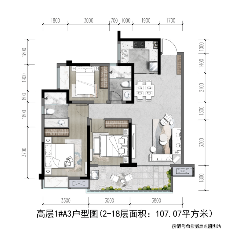 A3户型:107㎡(三室两厅两卫)