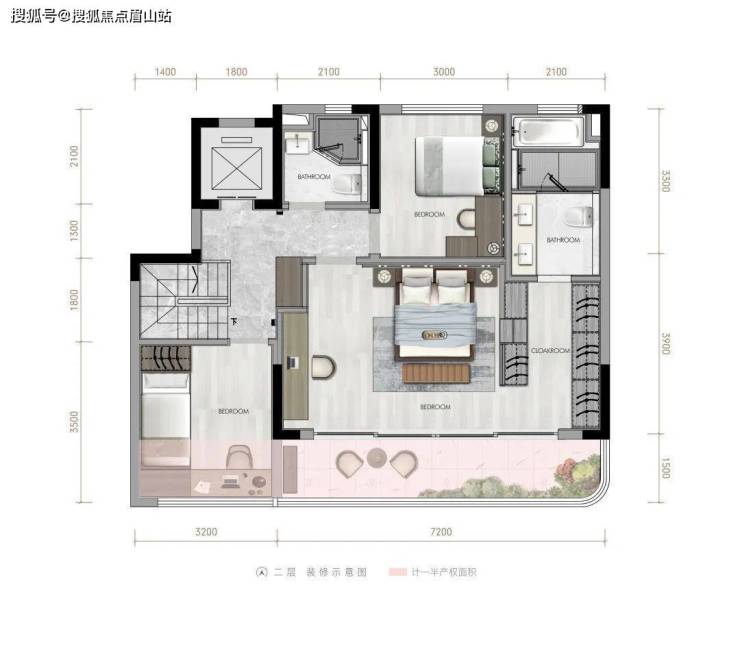 二层主要以起居卧室为主,三间卧室可以满足一家四口的多元化生活,全方位照顾每个家庭成员习惯。约7.2m的阳台与主卧套房相通,采光充足且通透。早可享阳光,夜可观星辰。