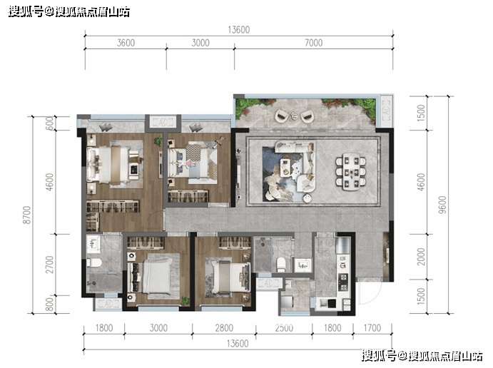 最难得还是该户型在增加了一个套房的情况下,公共空间竟没有减配,依然做到了约7.2米的大横厅,并配置了独立生活阳台。
