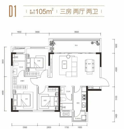此系列户型是项目的高性价比入门之选,在约105㎡的面积内实现三房两卫的全功能配置。约105㎡ 的D1户型采用LDK一体化设计,拥有约30㎡的阔绰客餐厅并连接6.6米宽景阳台,空间感强。主卧约20㎡,并可规划独立衣帽间,满足年轻家庭或首改客户对功能与舒适的双重需求。