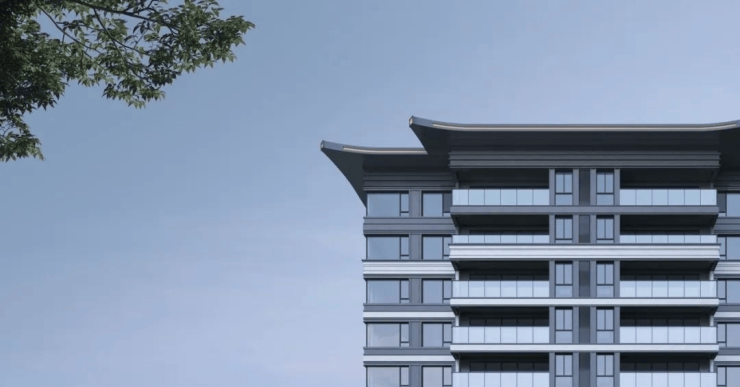建筑设计上,以传统三段式造型为基础,其中基座以中式元素和沉稳的深灰色石材,凸显建筑的稳重与典雅;标准段则以现代建筑的简约、轻盈,带来更加通透的韵律;而顶部采用传统建筑中的飞檐造型,诠释项目新中式风格的特色。